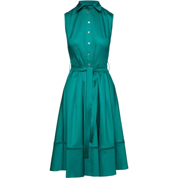 Deze dennengroene jurk is gemaakt van lichtgewicht geweven stretch gabardine stof. Het heeft een kraag en een sluiting aan de voorzijde die doorloopt tot aan de zoom met decoratieve knopen in schelpstijl. Er is een decoratieve vlecht, toon op toon, onder de schouders voor en achter en 19 cm van de zoom. Het heeft naaddetails aan de voorkant en coupenaden bij de buste. Er is een 5 cm brede ceintuur in dezelfde stof met plooien voor en achter. De jurk heeft 2 binnenzakken aan de voorkant. Ons model is 172cm en draagt maat 36/S. Metingen voor maat 36 (in cm) zijn: Schouder -34, Borst-42, Taille-36, Onderkant-68, Lichaamslengte-112.