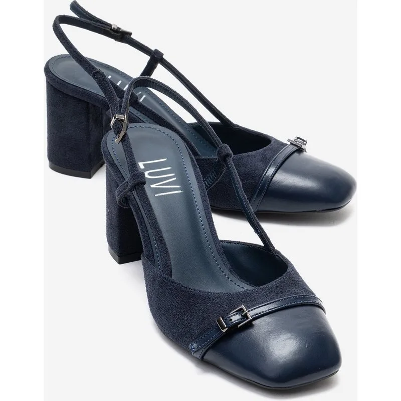 Een verfijnde blokhakschoen die architecturale lijnen combineert met subtiele luxe