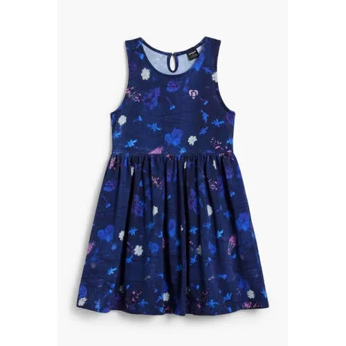 Met deze donkerblauwe meisjes jurk van Desigual voeg je gemakkelijk een vrolijk item toe aan de kledingkast van je kind. De mouwloze jurk heeft een comfortabele A-lijn pasvorm, waardoor er genoeg bewegingsvrijheid is om te rennen, spelen en draaien. Gemaakt van honderd procent katoen voelt de stof zacht aan op de huid en is de jurk geschikt voor dagelijks gebruik, van schooldagen tot familiedagen.Details die het verschil maken A-lijn model voor een speelse zwier en fijne bewegingsvrijheid Mouwloos ontwerp, ideaal voor warme dagen of met een vest erover Ronde hals die prettig aansluit zonder te knellen Knoopsluiting aan de achterkant voor makkelijk aan- en uittrekken All over print in kenmerkende Desigual stijl voor een levendige uitstraling Plooien aan de onderkant voor extra volume en een mooie valling Gemaakt van honderd procent katoen voor een zachte, ademende stofVoor schooldagen en vrije tijdDeze jurk past goed in de dagelijkse garderobe van peuters, kleuters en schoolkinderen. In de zomer draag je de jurk zo, op koelere dagen is hij makkelijk te combineren met een legging en een vest. Zo ontstaat in een paar stappen een complete outfit waar je kind zich de hele dag prettig in voelt.Desigual: kleurrijke stijl voor elke dagDesigual staat bekend om opvallende prints en creatieve details. De kinderkledingcollecties zijn ontworpen met oog voor draagcomfort en herkenbare, speelse dessins. Zo combineert Desigual praktische pasvormen met een eigenwijze stijl, zodat kinderen zich vrij kunnen bewegen en er tegelijk verzorgd uitzien.Een comfortabele jurk die elke doordeweekse dag net wat vrolijker maakt.
