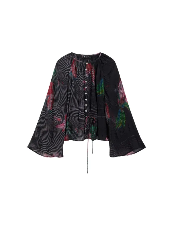 Breng kleur in je garderobe met deze Desigual blouse met bloemenprint. De blouse heeft een licht getailleerde pasvorm met ronde hals en lange flare mouwen die soepel rond de pols vallen. De bloemenprint over het hele model geeft elke outfit een kleurrijke uitstraling. Dankzij de ceintuur in de taille kun je het silhouet eenvoudig aanpassen.Bijzondere details en draagcomfort Gemaakt van 100% polyester, voelt licht aan en valt soepel om het lichaam Lange flare mouwen voor een zwierig effect Ronde hals en volledige knoopsluiting aan de voorzijde Inclusief ceintuur om de taille te accentueren Bloemenprint over het hele voor- en achterpand Zonder zakken voor een gladde voorkant Valt klein, een maat groter kan comfortabeler zittenVeelzijdig in het dagelijks dragenDeze blouse past goed bij zowel casual als meer geklede outfits, bijvoorbeeld voor werk of een etentje. Door de ceintuur strakker of losser te knopen, bepaal je zelf hoe recht of getailleerd de blouse valt. Ook open gedragen over een top ontstaat er een lichte extra laag.Desigual: kleur en karakterDesigual staat bekend om uitgesproken prints en creatieve details. Elke collectie heeft een eigen handschrift, zodat je kledingkast steeds weer vernieuwend oogt. Met deze blouse haal je een typisch Desigual item in huis dat een herkenbaar deel van je outfits kan worden.Een blouse met opvallende bloemenprint die direct kleur toevoegt aan je dagelijkse look.