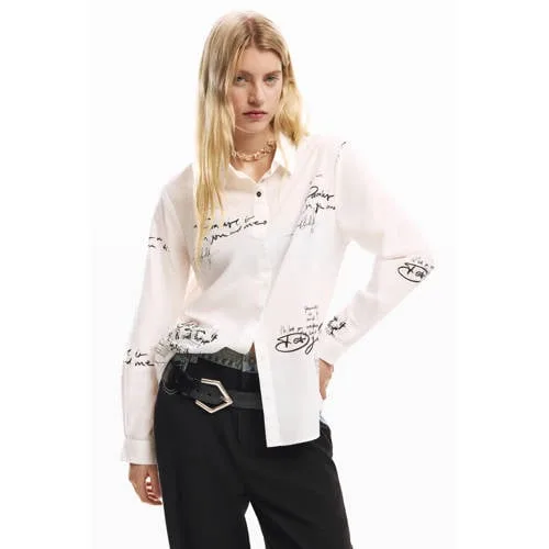 Breng wat speelsheid in je garderobe met deze Desigual blouse van 100% katoen. De subtiele tekstprint geeft direct karakter aan je outfit, terwijl de klassieke details ervoor zorgen dat de blouse makkelijk te combineren is. Door de rechte mouwen en de gladde stof ontstaat een rustige basis met een grafisch accent, passend bij zowel een werkdag als een casual moment.Details die het verschil maken Gemaakt van 100% katoen, dat zacht aanvoelt op de huid en prettig draagt gedurende de dag Lange mouwen met rechte mouwinzet voor een rustige, moderne lijn Klassieke kraag en volledige knoopsluiting aan de voorkant voor een nette afwerking Tekstprint die de karakteristieke Desigual uitstraling geeft Zonder borstzakken voor een strak en verzorgd silhouet Valt relatief smal, kies eventueel een maat groter als je wat extra ruimte wiltVoor werk, weekend en alles daartussenDeze blouse past moeiteloos bij een jeans, pantalon of rok. Dichtgeknoopt onder een blazer oogt de outfit verzorgd, open over een T-shirt krijgt de blouse een meer ontspannen uitstraling. Zo wissel je eenvoudig tussen verschillende momenten op een dag.Desigual: opvallende details in het dagelijks levenDesigual staat bekend om speelse prints, kleur en grafische details. Iedere collectie is ontworpen met oog voor eigenheid, zodat je kledingkast net zo veelzijdig is als je dagelijkse leven.Een blouse die comfort, duidelijke lijnen en een herkenbare print samenbrengt in één draagbaar ontwerp.