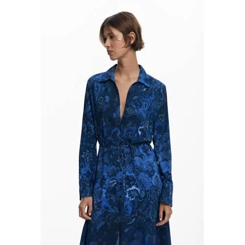 Deze Desigual jurk heeft lange rechte mouwen en een klassieke kraag. De jurk komt tot het midden en is gemaakt van viscose. De paisley print en ceintuur geven je outfit een frisse uitstraling.