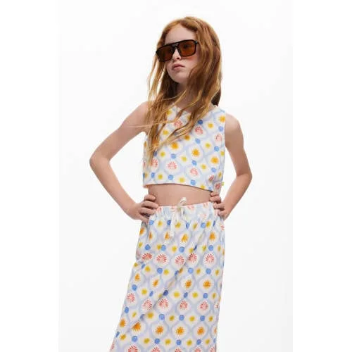 Fris, speels en klaar voor elke dag, deze Desigual meisjes top geeft elke outfit direct een vrolijke update. De mouwloze cropped top heeft een ronde hals en valt iets korter, waardoor hij mooi boven een hoge jeans, short of rok valt. De ecru basis met gele en blauwe accenten past makkelijk bij verschillende items in de kast en zorgt voor een levendige, maar rustige look. Gemaakt van 100% katoen, voelt de stof zacht aan op de huid en is hij prettig om de hele dag te dragen.Kleurrijke details voor elke dag Mouwloze cropped top, ideaal voor warme dagen of onder een vest Ecru met gele en blauwe accenten voor een frisse, meerkleurige uitstraling Ronde hals die comfortabel aansluit bij de nek Gemaakt van 100% katoen, voelt zacht en luchtig aan Geschikt voor schoolkinderen en tieners, mooi te combineren met hoge taille broeken en rokken Geen zakken, waardoor de top strak en rustig oogtGeschikt voor school, vrije tijd en vakantieDeze top past goed bij het dagelijks leven, van schooldag tot logeerpartij en vakantie. In de zomer draag je hem solo op een short, op koelere dagen staat hij leuk onder een open blouse of een zacht vest.Desigual voor kinderenDesigual staat bekend om kleur en speelse prints. De kindermodecollectie sluit daar naadloos op aan, met ontwerpen die comfortabel zitten en genoeg bewegingsvrijheid bieden. Zo krijgen kinderen kleding die prettig draagt en opvalt door de uitgesproken, vrolijke stijl.Een luchtige top in de kast die keer op keer uit de lade gepakt kan worden.
