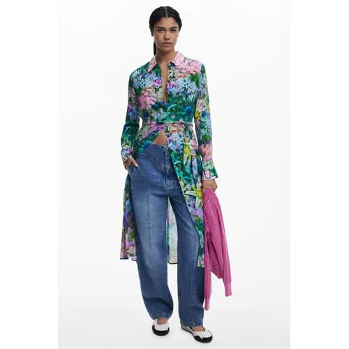Breng kleur en beweging in je garderobe met deze groene en blauwe Desigual blousejurk. De lange jurk is gemaakt van viscose, dat soepel om je lichaam valt en prettig aanvoelt op de huid. De opvallende all over bloemenprint zorgt direct voor een speels beeld, terwijl de klassieke kraag en knoopsluiting voor een rustig contrast zorgen.Kenmerken van deze bloemen blousejurk Lange blousejurk met elegante lengte voor een lang, recht silhouet Gemaakt van viscose voor een soepele, lichte stof Groen/blauwe all over print met bloemen voor een levendig totaalbeeld Klassieke kraag en knoopsluiting over de voorzijde Rechte lange mouwen voor een rustige, tijdloze uitstraling Ceintuur in de taille om de pasvorm naar wens te stylen Praktische zijzakken die discreet in de zijnaden zijn verwerktVan werkdag tot weekendDeze blousejurk leent zich goed voor verschillende momenten. De lange lengte en sluiting met knopen maken de jurk geschikt voor een werkdag, terwijl de bloemenprint en het ceintuur zorgen voor een meer ontspannen sfeer in het weekend.Desigual: kleur met karakterDesigual staat bekend om uitgesproken prints en verrassende combinaties. Bij elke collectie staan kleur en detail centraal, zodat je kledingkast altijd variatie te bieden heeft. In deze jurk komt die herkenbare signatuur duidelijk terug.Een opvallende jurk die je elke dag eenvoudig een eigen draai geeft.