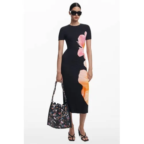 Deze zwarte Desigual jurk combineert een vrouwelijke pasvorm met opvallende details. De midi lengte en bodycon uitstraling sluiten mooi aan op het lichaam, terwijl de kokerjurk-stijl zorgt voor een nette, verzorgde look. De ronde hals en korte, rechte mouwen geven het geheel een rustige basis, waardoor de bloemenprint extra goed naar voren komt.Kenmerken die opvallen Midi lengte met kokerpasvorm voor een elegante, aansluitende look Korte, rechte mouwen die veel bewegingsvrijheid geven Ronde hals voor een tijdloze en makkelijk te combineren bovenkant Zwarte kleur als basis, afgewerkt met een all-over bloemenprint Split aan de onderzijde voor extra loopcomfort en een sierlijk effect Gemaakt van viscose, een soepele stof die zacht langs het lichaam valt Geen sluiting, de jurk trek je gewoon over het hoofd aan Geen zakken, waardoor de pasvorm strak en gestroomlijnd blijftVoor werkdagen, avonden en alles ertusseninDeze midi jurk past bij verschillende momenten. Geschikt voor kantoor met een blazer en pumps, maar ook makkelijk te dragen met sandalen of sneakers voor een meer relaxte dag. De split maakt lopen comfortabel, ook als je langere tijd onderweg bent.Desigual signature stijlDesigual staat bekend om kleur, print en doordachte details. De collecties hebben vaak een creatieve twist, zonder in te leveren op draagbaarheid. Met deze jurk haal je een herkenbaar Desigual item in huis dat stijl en comfort combineert in één ontwerp.Een veelzijdige jurk die je garderobe direct meer karakter geeft.