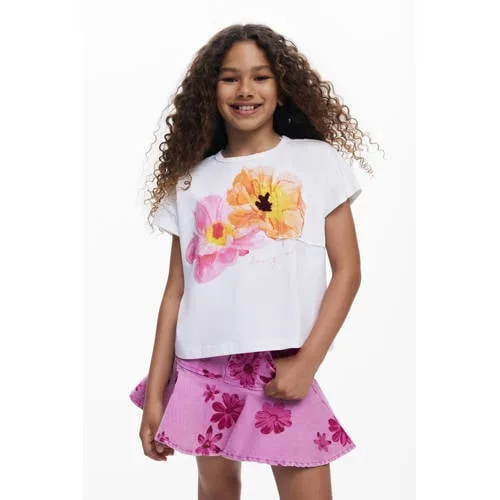Met dit Desigual T-shirt voor meisjes krijgt elke dagelijkse outfit een frisse, speelse update. Het witte shirt vormt een rustige basis, terwijl de bloemprint zorgt voor een vrolijke uitstraling. De ronde hals en korte, rechte mouwen maken het een fijn item voor schooldagen, speelafspraken en uitstapjes. Dankzij het materiaal van 100% katoen voelt de stof zacht en soepel aan op de huid.Vrolijke details voor elke dag Wit T-shirt met bloemprint voor een frisse, levenslustige look Gemaakt van 100% katoen, voelt zacht aan en is prettig om te dragen Korte, rechte mouwen geven voldoende bewegingsvrijheid tijdens het spelen Ronde hals die netjes aansluit en makkelijk over het hoofd gaat Geschikt voor peuters, kleuters, schoolkinderen en tieners Los te dragen op een jeans, rok of korte broekComfortabel T-shirt voor school en vrije tijdDit T-shirt past goed bij de dagelijkse garderobe. Het kan eenvoudig gecombineerd worden met een favoriete spijkerbroek of legging en is geschikt voor zowel rustige dagen thuis als drukke dagen op school. Door de luchtige katoenkwaliteit blijft het ook bij warmer weer aangenaam om te dragen.Desigual met kleur en karakterDesigual staat bekend om kleurrijke designs en speelse prints die net even anders zijn. De kinderkleding van Desigual combineert opvallende dessins met praktisch draaggemak. Zo krijgt elke dag een beetje extra karakter, zonder dat je inlevert op comfort of gemak in het dagelijks leven.Een fijn T-shirt dat er zorgeloos uitziet en net zo prettig voelt als het oogt.