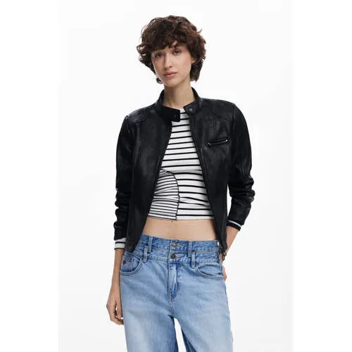 Deze zwarte damesjas van Desigual heeft een ritssluiting en een ronde hals. De jas is gemaakt van imitatieleer en is geschikt voor de lente. Het ontwerp heeft lange mouwen en praktische zakken aan de voorkant.