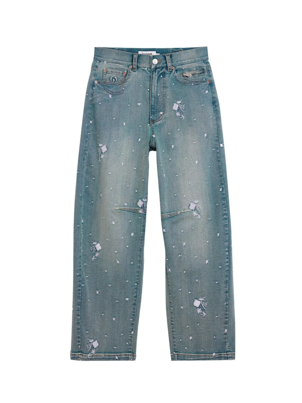 Design: Ritssluiting, 5-pocket-style, Achterzak, Muntenzak, Zakken aan de zijkant; Type sluiting: Ritssluiting; Materiaal: Denim; Motief: Effen; Details: Borduursels; Extra's: Contrasterende naden, Label patch/label flag, Riemlussen; Wassing: ripped; Lengte: Lang/maxi; Pasvorm: Loosefit; Taillehoogte: Mid waist