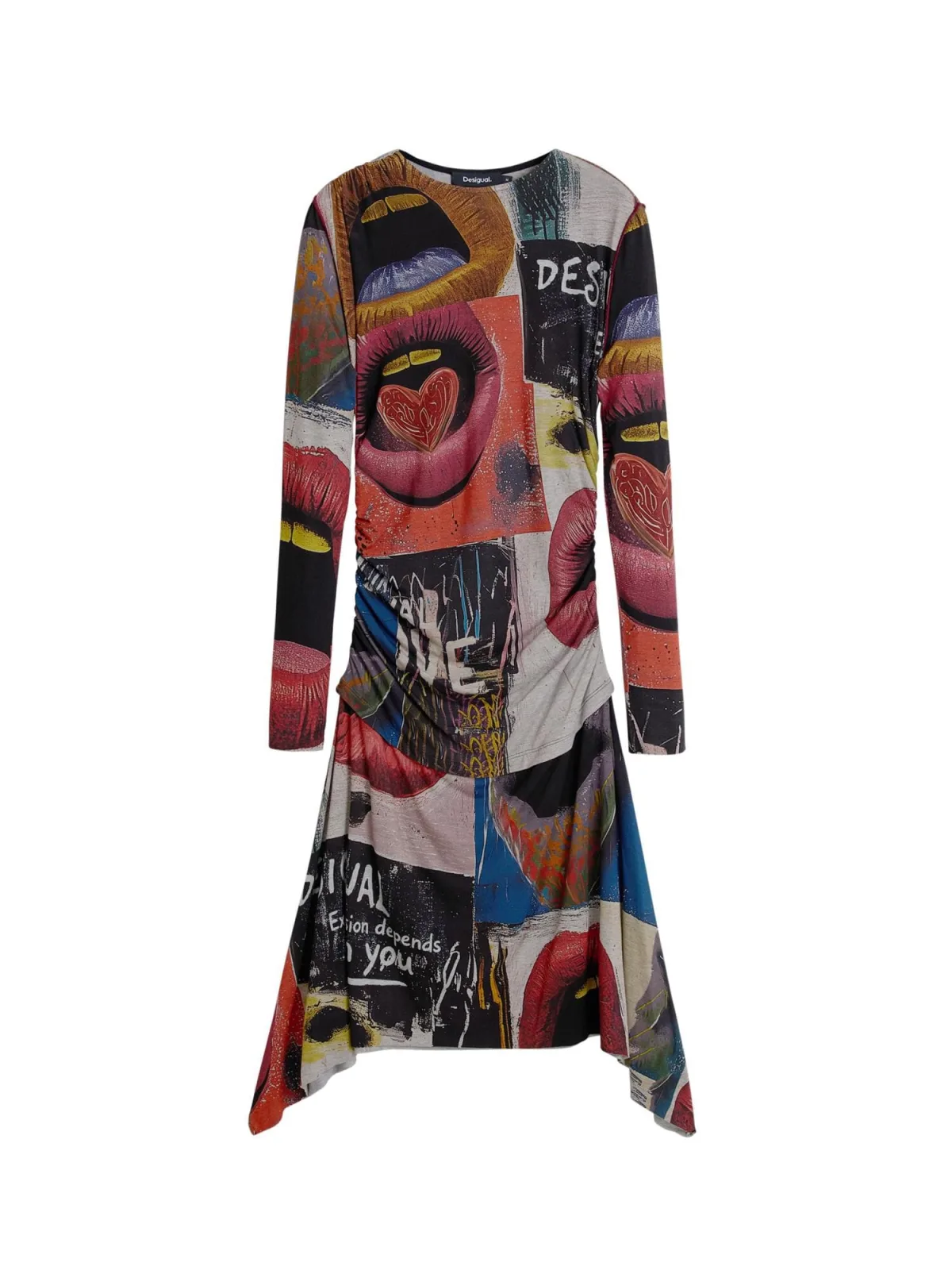 Val op in het dagelijks leven met deze Desigual midi jurk met all over print. De karakteristieke kleurrijke print zorgt direct voor een levendig geheel, terwijl de middellange lengte en A-lijn pasvorm zorgen voor een silhouet dat veel mensen goed staat. De jurk is gemaakt van viscose, wat soepel langs het lichaam valt voor een prettige bewegingsvrijheid.Kleurrijke details en comfortabele pasvorm A-lijn model dat licht uitloopt vanaf de taille voor een silhouet dat de taille accentueert Midi lengte, ideaal voor zowel werk als vrije tijd Lange, rechte mouwen voor net iets meer bedekking op koelere dagen Ronde hals die eenvoudig te combineren is met sieraden All over print in meerdere kleuren voor de kenmerkende Desigual uitstraling Gemaakt van viscose, een zachte stof met een soepele valling Ontworpen zonder sluiting, zodat de jurk eenvoudig over het hoofd aan te trekken is Geen zakken, waardoor de lijnen van de jurk rustig en gestroomlijnd blijvenVoor werk, weekend en alles daartussenDeze jurk is geschikt voor uiteenlopende momenten. Combineer met sneakers voor een ontspannen dag in de stad of draag er enkellaarsjes onder voor een meer geklede outfit. Dankzij de lange mouwen en midi lengte voelt de jurk passend in verschillende seizoenen.Desigual: herkenbare stijl met kleurDesigual staat bekend om opvallende prints en rijke kleurcombinaties. De collecties zijn ontworpen met oog voor detail en een herkenbare signatuur, zodat je telkens weer een item kiest dat duidelijk bij het merk hoort en lang in je kast meegaat.Een kleurrijke aanvulling waarmee je garderobe weer een nieuwe optie rijker is.
