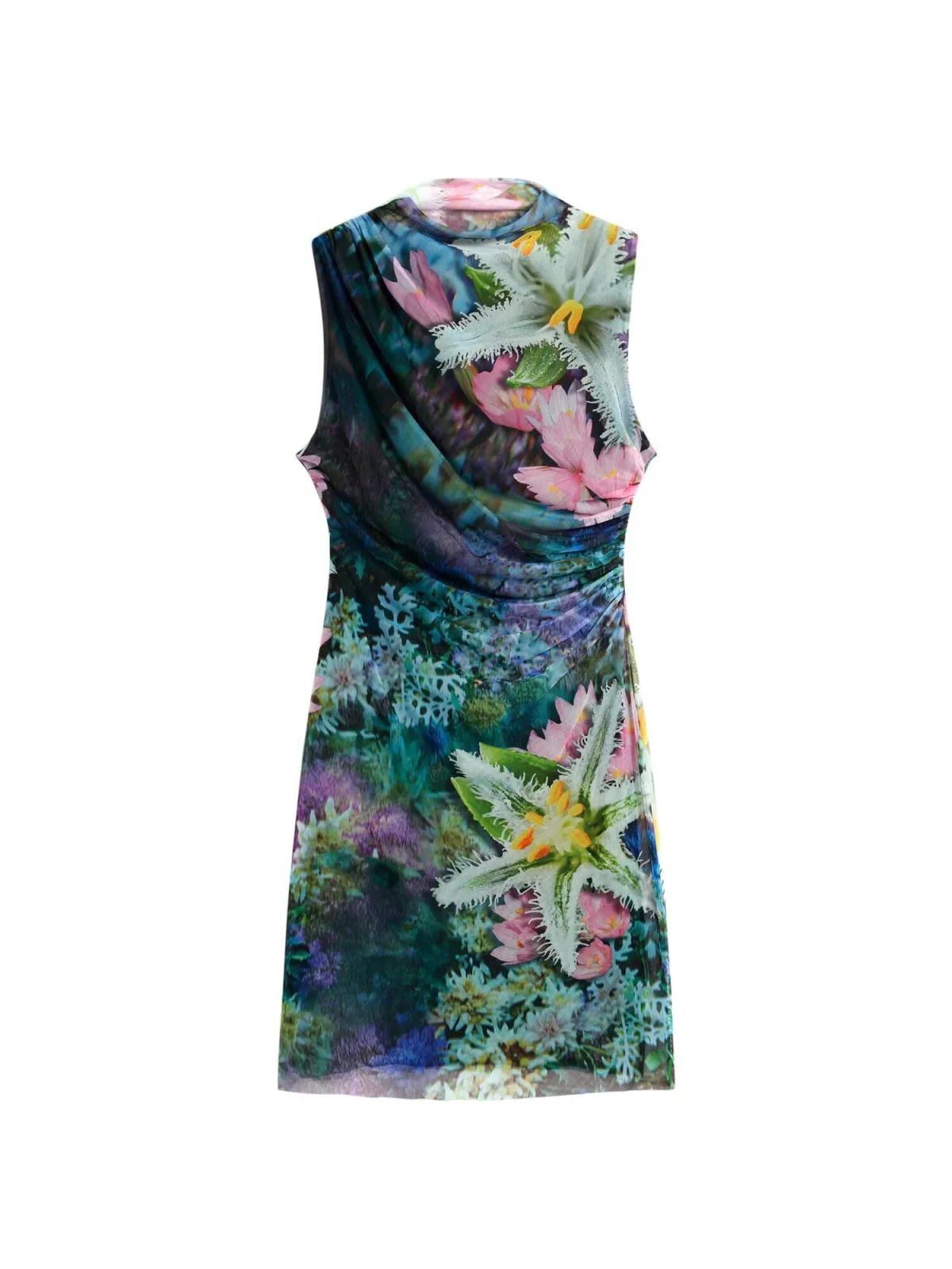 Design: Materiaal mix; Halstype: Opstaande kraag; Motief: Bloemenprint; Soort bandjes: Brede bandjes; Details: Gedrapeerd; Extra's: All-over patroon; Lengte: Kort/mini; Pasvorm: Aansluitende pasvorm; Armlengte: Mouwloos