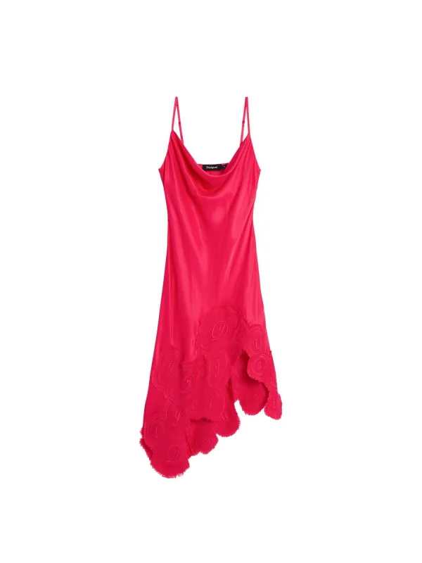Design: Asymmetrische zoom, Gefranjerde zoom, Ritszakken aan de zijkant; Type sluiting: Ritssluiting; Materiaal: Viscose; Halstype: Watervalhals; Motief: Effen; Soort bandjes: Spaghettibandjes; Details: Borduursels; Extra's: Verstelbare bandjes, Applicaties, Fijne stof; Lengte: Knielengte; Snit: Getailleerd; Pasvorm: Normale pasvorm; Armlengte: Mouwloos