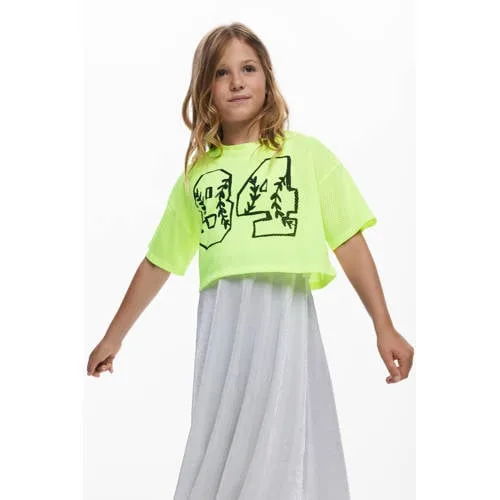Deze limegroen/zilveren Desigual meisjes jurk valt meteen op door de frisse kleur en speelse details. Het T-shirtmodel met maxi lengte combineert het gemak van een shirt met de zwier van een lange jurk. De vrolijke meerkleurige print met tekst past goed bij meiden die graag iets opvallends dragen, zonder dat het te druk wordt. De zachte, soepele stof voelt licht aan, fijn voor alledaagse momenten.Speelse maxi jurk met vrolijke details Limegroen met zilveren accenten voor een frisse, moderne uitstraling Maxi lengte in T-shirtstijl voor een relaxte pasvorm Korte, rechte mouwen en ronde hals voor gemakkelijk draagcomfort Plooien in de rok zorgen voor extra zwier bij elke beweging Geen sluiting en geen zakken, je trekt de jurk eenvoudig over het hoofd aan Vrolijke meerkleurige print met tekst die zorgt voor een speels karakter Geschikt voor schoolkinderen en tieners in de dagelijkse collectieElke dag draagbaarDe jurk is ideaal voor naar school, een dagje stad of een verjaardagsfeestje. Sneakers of sandalen eronder en je kind is in één keer klaar. Door het lichte, soepele materiaal beweegt de jurk prettig mee tijdens spelen en dansen.Desigual: kleur en karakterDesigual staat bekend om kleurrijke ontwerpen met opvallende prints en eigenzinnige details. Deze jurk past daar helemaal in en biedt een herkenbare Desigual look in een praktische, kindvriendelijke uitvoering.Een speelse maxi jurk die elke gewone dag net iets bijzonderder maakt.