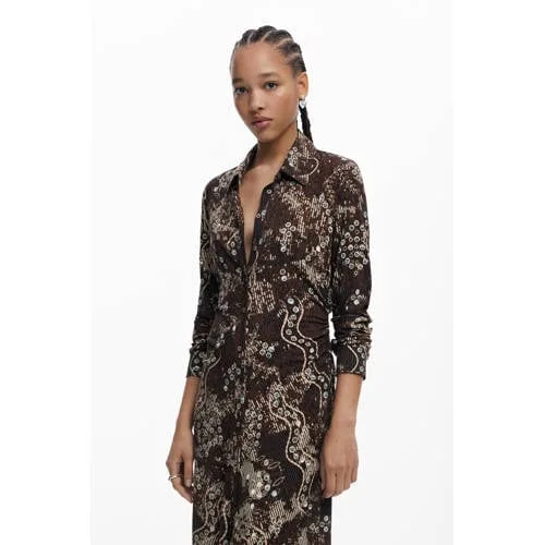Deze jurk van Desigual is gemaakt van viscose en heeft een klassieke kraag. De midi-jurk heeft lange mouwen, een middel lange lengte en een knoopsluiting. De bruine jurk heeft geen zakken.