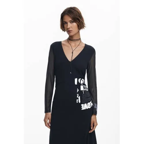Deze Desigual jurk heeft lange mouwen en een V-hals. De jurk is gemaakt van viscose met een all-over print. De middel lange lengte geeft een moderne uitstraling en rechte mouwen maken het af.