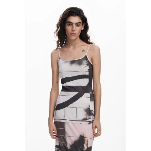 Deze jurk van Desigual heeft een vierkante hals en spaghettibandjes. Gemaakt van polyester in een kleurrijk ontwerp. De lengte is middel, perfect voor elke gelegenheid. Zakken of sluitingen zijn er niet.