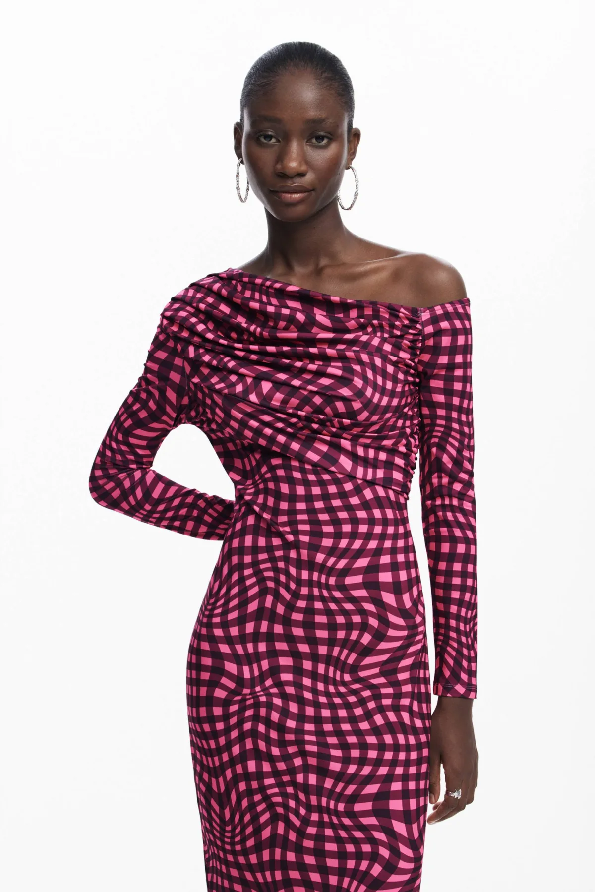 Deze roze jurk van Desigual is gemaakt van polyester. De jurk heeft een vierkante hals en lange mouwen. Het asymmetrische ontwerp met plooien geeft deze midi jurk een speelse look. Perfect voor elke gelegenheid.