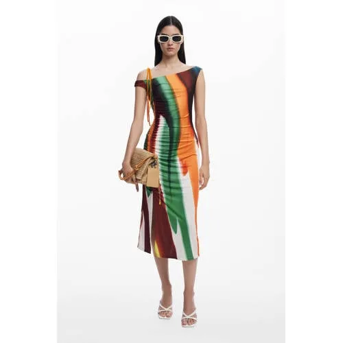 Voor een zomerse look met net iets extra's is deze Desigual jurk zonder mouwen een blikvanger in je garderobe. De midi lengte, off shoulder halslijn en kleurrijke all over print zorgen samen voor een open en speels geheel. De soepele, zachte stof volgt je bewegingen soepel en het model zonder sluiting trek je gemakkelijk aan.Details die opvallen Midi jurk met middelhoge lengte, passend voor warme dagen en feestelijke momenten Off shoulder halslijn die de schouders vrij laat Korte, rechte mouwen die licht en luchtig aanvoelen Kleurvolle all over print in multi, kenmerkend voor Desigual Zonder sluiting, je trekt de jurk eenvoudig over het hoofd aan Rekbare stof met een klein deel elastaan voor een aansluitende pasvorm Zonder zakken voor een glad silhouet dat langs het lichaam valt Te dragen als zomerjurk, feestjurk of als jurk voor een bruiloftsgastVoor zomerse dagen en feestelijke avondenDeze jurk is geschikt voor momenten waarop je wat gekleder wilt gaan, maar toch luchtig en comfortabel gekleed wilt zijn. Denk aan een bruiloft, een tuinfeest of een diner op vakantie. Combineer de jurk met sandalen of hakken en een compacte tas voor een verzorgd geheel.Desigual: uitgesproken en creatiefDesigual staat bekend om creatieve prints, rijke kleuren en verrassende combinaties. De collecties hebben een herkenbare stijl met aandacht voor bijzondere details en vrouwelijk design. Met deze jurk voeg je een uitgesproken onderdeel toe aan je kledingkast.Een kleurig jurkje waarmee je eenvoudig een feestelijke outfit samenstelt.