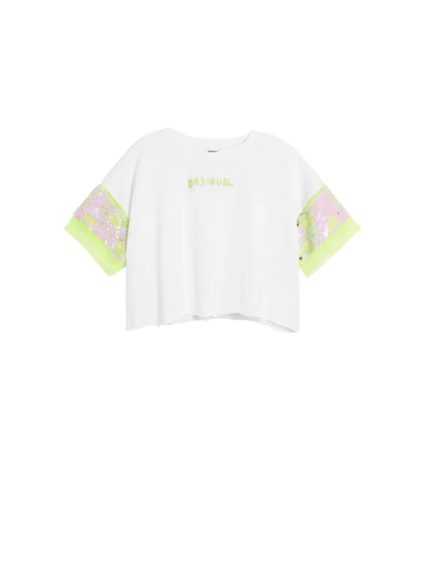 Design: Geribbelde kraag, Open randen, Nektape; Materiaal: Jersey; Halstype: Ronde hals; Motief: Logoprint; Details: Pailletten; Extra's: Applicaties, Label patch/label flag, Op staal naden, Voelt zacht aan; Pasvorm: Losse pasvorm; Armlengte: Halve mouw; Lengte: Normale lengte