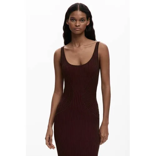 Deze bruine Desigual midi jurk is een lichte, zomerse keuze die net zo makkelijk aanvoelt als de jurk eruitziet. Het effen design legt de nadruk op de pasvorm en de lengte tot rond de knie. De soepele stof valt losjes om het lichaam en beweegt zacht met je mee, ideaal voor warme dagen waarop je er verzorgd uit wilt zien zonder veel moeite te doen.Zomerse details die het verschil maken Middellange jurk met een midi lengte tot rond de knie, geschikt voor zowel overdag als in de avond Mouwloos ontwerp dat luchtig blijft tijdens zomerse temperaturen Ronde hals die mooi aansluit en ruimte laat voor een ketting of subtiele sieraden Gemaakt van een zachte viscosekwaliteit die soepel en licht aanvoelt Geen sluiting en geen zakken, zodat de jurk een glad silhouet heeft Effen bruine kleur die rustig oogt en goed te combineren is met sandalen of sneakersZo draag je deze bruine zomerjurkVoor een ontspannen dag combineer je de jurk met platte sandalen en een lichte schoudertas. Mag het iets aangekleder, dan zijn sleehakken en een fijne armband voldoende om de look aan te passen. Door de midi lengte blijft de jurk passend voor verschillende gelegenheden.Desigual met een verfijnde twistDesigual staat bekend om mode met een eigen karakter. In deze jurk komt dat terug in de zorg voor pasvorm en materiaal, in een rustigere en meer ingetogen uitvoering. Zo kies je voor een ontwerp dat opvalt door de lijn en de kleur, zonder drukke prints.Een lichte zomerjurk die je garderobe op een subtiele manier aanvult.