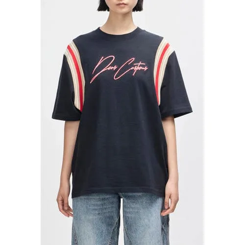 Ga voor een stoere, ontspannen look met dit Deus Ex Machina dames T-shirt in zwart. Het shirt heeft een tijdloze ronde hals en korte rechte mouwen, waardoor het makkelijk combineert met je favoriete jeans, short of rok. De contrasterende bies langs de hals en mouwen geeft net wat extra karakter, terwijl de tekstprint duidelijk verwijst naar het iconische Deus Ex Machina DNA. Gemaakt van 100 procent katoen voelt het T-shirt zacht en comfortabel aan, ideaal voor elke dag.Zwarte basic met rebel details Zwart T-shirt met tekstprint voor een duidelijke, grafische uitstraling Gemaakt van 100% katoen voor een zachte touch en prettig draaggevoel Korte rechte mouwen die soepel langs je armen vallen Ronde hals met contrast bies voor een frisse, sportieve knipoog Valt binnen de Rebel collectie, met een casual en eigenwijze stijl Los te dragen of in je broek gestopt, afhankelijk van je outfitMakkelijk te stylen, elke dag opnieuwDit T-shirt past goed bij casual looks. Combineer het met een straight jeans en sneakers voor een relaxte dag, of met een leren jacket voor extra pit. In de lente is het perfect solo te dragen, op frissere dagen kun je het eenvoudig onder een open blouse of jas stylen.Deus Ex Machina: inspiratie uit surf en motorcultuurDeus Ex Machina staat bekend om collecties die zijn geïnspireerd op motoren, surf en streetwear. Grafische prints, herkenbare logo's en comfortabele fits spelen daarin een belangrijke rol. Je haalt met dit T-shirt een item in huis dat is ontworpen met aandacht voor detail en een duidelijk eigen signatuur.Een veelzijdig T-shirt dat moeiteloos een favoriet in je kast kan worden.