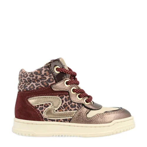 Deze sneaker van Develab heeft een panterprint met een normale leest en een platte zool. De buitenkant en voering zijn gemaakt van leer, je sluit met een rits en veters.