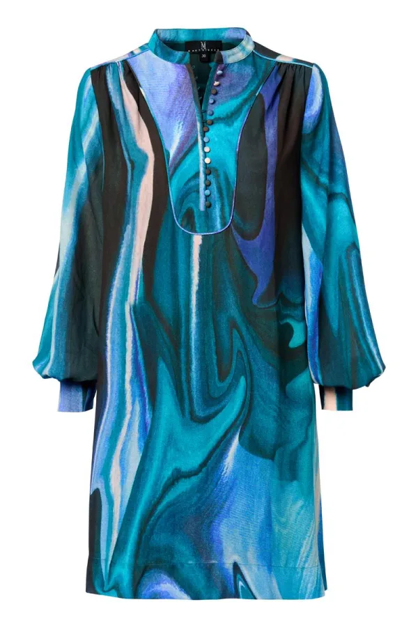 Stijlvolle damesjurk met verfijnde details en unieke printDe Dhalia Print Jurk is een schitterend en elegant kledingstuk met oog voor detail. De semi-transparante stof geeft een luchtig en verfijnd effect, terwijl de voering zorgt voor comfort en ondoorzichtigheid tijdens het dragen. De olieachtige print straalt in diverse kleuren, waaronder paars, aquagroen en een zwarte achtergrond, wat een eigentijdse en trendy uitstraling toevoegt. De prachtig uitgewerkte details, zoals het opstaande kraagje met plastron en bedekte knoopjes, de pofmouwen met manchetten en dezelfde verfijnde knoopjes, evenals de luxe plooien en piping bij de schoudernaden en rugpas, dragen bij aan de geraffineerdheid van het ontwerp. De jurk heeft een wijd uitlopende, lange blouse-stijl die zorgt voor een flatterend en elegant silhouet. De subtiele steekzakken in de zijnaden voegen een comfortabel element toe aan deze chique printjurk, waardoor de jurk zowel elegantie als functionaliteit combineert. Met zijn opvallende print, pofmouwen en prachtige details is deze jurk een veelzijdige aanvulling op elke garderobe. Op zoek naar extra warmte in de winter? Combineer de jurk met het aquagroene Parker vest voor een opvallende en stijlvolle look. Deze printjurk is absoluut een waardevolle toevoeging aan je nieuwe garderobe!"