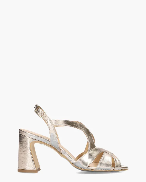 Sandalen voor dames Roni uit de collectie van het merk Di Lauro. Dit model heeft een bovenwerk van gestructureerd leer in een metallic gouden tint. De binnenkant en het voetbed zijn in glad leer uitgevoerd. De bijzondere hak is circa 8,5 cm hoog. Het riempje rond de enkel is verstelbaar. De zool en de inzet onder de hak zijn van rubber