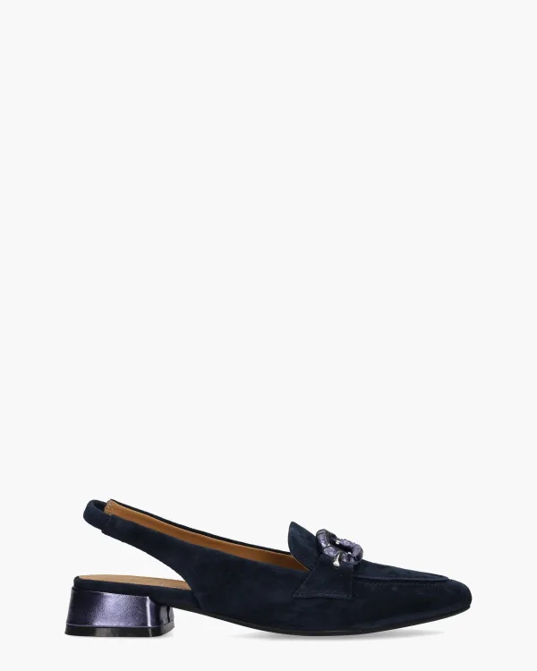 Dit stijlvolle model Wasima van Di Lauro in diep donkerblauw combineert de klassieke look van een loafer met de luchtigheid van een slingback. Het suède bovenwerk geeft de schoen een luxe uitstraling, terwijl de blauwe metallic gesp op de wreef direct de aandacht trekt. De subtiele metallic blokhak van 3 cm voegt net dat beetje extra