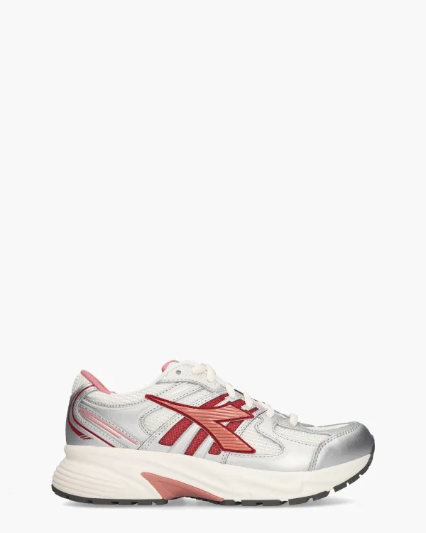 Een statement damessneaker waarin sportieve roots en design samenkomen: de Mythos Star Metallic 501.183695-D1347 van Diadora Sport. Het bovenwerk bestaat uit off-white mesh met metallic zilveren leren panelen, verrijkt met koraalrode en rode rubberen en kunststof details voor een energieke uitstraling. Binnenin zorgen een uitneembaar