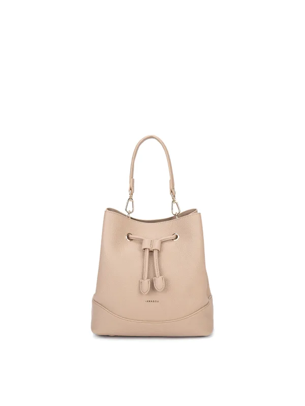 Dameshandtas met trekkoordsluiting. één open binnenzak. afwezige externe zakken. verstelbare en afneembare schouderband. In PU-handvat. een binnencompartiment. extern materiaal. Ongevoerd interieur. Afmetingen: 24x25,5x16 cm. Modeproduct
