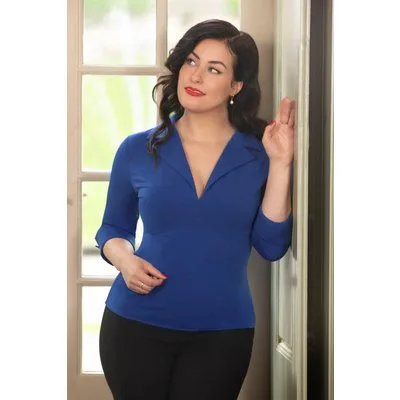 ''Act like a lady, think like a boss!'' Ook dit seizoen hebben onze getalenteerde in-house designers zich laten inspireren door draagbare en klassieke silhouetten met een White Collar Edge; items voor de power vrouw die de zakenwereld omver blaast met haar hyper vrouwelijke silhouet. Deze licht getailleerde classy blouse heeft het comfort van een top en is uitgevoerd in een stevige en soepele kobaltblauwe travel stof met een fijne stretch, waardoor ze heerlijk comfortabel draagt! ''Stay classy and comfy!'' * Licht getailleerd * Puntig revers kraagje * 3/4 mouwtjes met puntige omslagjes * Blinde rits achterzijde * Lang genoeg om op een normale heupbroek te dragen * Gorgeous Nicky is 1,68 m: haar pumps en accessoires zijn haar eigen treasures