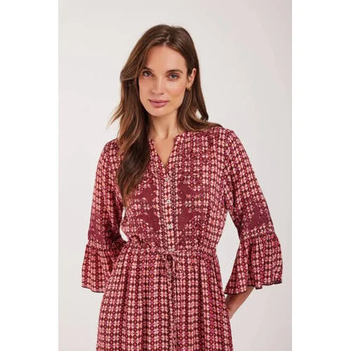 Breng beweging in je garderobe met de Didi Dress Swing jurk in donkerrood met grafische print. Deze midi blousejurk heeft een losse A-lijn pasvorm die soepel langs het lichaam valt en door het tunnelkoord rond de taille naar wens is aan te trekken. De combinatie van de V-hals, knoopsluiting en subtiele borduursels zorgt voor een verzorgde uitstraling die zowel overdag als in de avond passend is.Grafische jurk met speelse details A-lijn midi jurk in blousemodel voor een soepel vallende pasvorm Donkerrode kleur met grafische print voor een krachtig kleurbeeld V-hals met volledige knoopsluiting aan de voorzijde Driekwart trompetmouwen met licht uitlopende mouwvorm Tunnelkoord in de taille om de pasvorm eenvoudig aan te passen Zakken voor, handig voor kleine essentials of een ontspannen houding Gemaakt van soepel vallend rayon dat licht en zacht aanvoelt Borduursels als verfijnde, decoratieve afwerkingVeelzijdig te dragen midi jurkDeze Dress Swing jurk laat zich gemakkelijk inpassen in verschillende momenten van de dag. De midi lengte geeft een aangeklede indruk, terwijl de trompetmouwen en grafische print een opvallend detail toevoegen. Het tunnelkoord maakt het mogelijk om de taille te accentueren of de pasvorm wat losser te dragen.Didi: stijl met oog voor detailDidi richt zich op kleding met doordachte details en comfortabele pasvormen. Elk ontwerp is gemaakt om goed aan te sluiten op het dagelijkse gebruik, met prints, kleuren en afwerkingen die onderling goed te combineren zijn. Deze jurk is een vaste basis in de garderobe waar vaak naar gegrepen kan worden.Een jurk die soepel meebeweegt met jouw dag, van eerste afspraak tot laatste koffie.