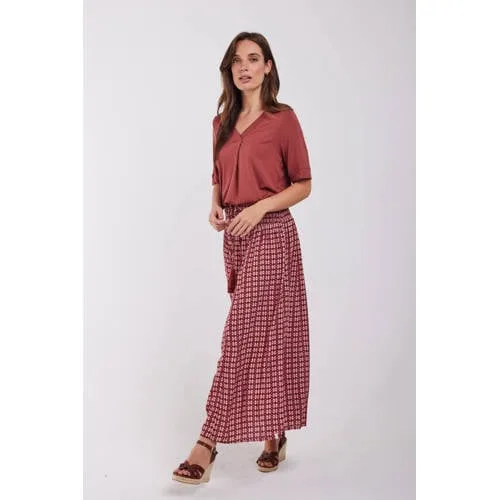 De donkerrode Didi Skirt Magic rok geeft een vrouwelijke, ontspannen look. Deze midi rok valt soepel om het lichaam en heeft een subtiele A-lijn, waardoor er een natuurlijke zwier in de stof ontstaat. Door de middelhoge lengte is dit een praktische rok voor alledaags gebruik en ook geschikt voor een wat nettere gelegenheid.Comfort en details in één rok Gemaakt van rayon, een soepele stof die prettig aanvoelt op de huid Midi lengte en A-lijn model voor een elegant vallende pasvorm Elastische tailleband met tunnelkoord voor een comfortabele, aanpasbare taille Smockwerk in de taille zorgt voor een speels en aangesloten effect Grafische print in donkerrood voor een moderne uitstraling Geen zakken, waardoor de rok glad langs de heupen valtGeschikt voor werk, vrije tijd en casual momentenDeze midi rok is geschikt voor verschillende momenten op de dag. De lengte en het soepele materiaal maken de rok passend voor zowel kantoor als ontspannen momenten in het weekend. Door de elastische tailleband blijft de rok comfortabel zitten, ook als je veel beweegt of lang zit.Didi en aandacht voor pasvormDidi ontwerpt kleding met aandacht voor pasvorm en detail. De focus ligt op modellen die soepel vallen en prettig aansluiten op het lichaam. Skirt Magic sluit hierbij aan door de combinatie van een elastische taille, smockdetail en vloeiende stof, waardoor de rok eenvoudig in het dagelijks leven te dragen is.Een sfeervolle basic met karakter, geschikt voor dagen waarop je een verzorgde en ontspannen uitstraling wilt.