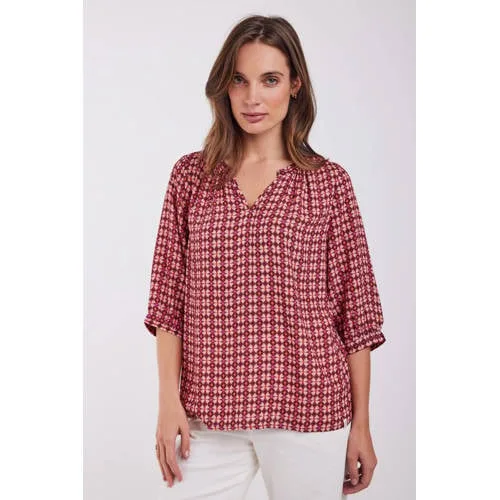 Breng structuur en kleur in je garderobe met de Didi blouse Salina. Deze dames top heeft een grafische print die direct opvalt, zonder druk te ogen. De soepele stof van 100% rayon valt mooi langs het lichaam en voelt licht aan op de huid. De V-hals geeft een open, vrouwelijke uitstraling, terwijl de driekwart mouwen zorgen voor een luchtig gevoel op warmere dagen en een fijn laagje op koelere momenten.Details die het verschil maken Gemaakt van 100% rayon voor een zachte, soepelvallende stof Grafische print voor een moderne, stijlvolle uitstraling V-hals die het hals- en decolletégebied subtiel accentueert Driekwart, rechte mouwen voor een ontspannen pasvorm rond de armen Geen zakken voor een rustige, strakke lookVeelzijdig te combineren in elke outfitDeze blouse past makkelijk in verschillende looks. Draag de top los over een slim fit broek voor een nette, dagelijkse outfit of stop de voorkant in een rok of jeans voor een meer gedefinieerde taille. Door de driekwart mouwlengte is de blouse geschikt voor zowel kantoor als vrije tijd.Didi: eigentijdse mode met aandacht voor detailDidi staat bekend om collectie-items die goed te combineren zijn en lang meegaan in je kledingkast. Met aandacht voor prints, kleuren en draaggemak ontwerpt Didi kleding die past bij een actief leven, van werk tot weekend. Zo kies je voor een merk dat stijl koppelt aan praktische details.Een moderne blouse die je garderobe op een toegankelijke manier meer kleur en karakter geeft.