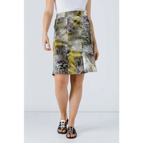 Zomerrok met dierenprint in stretch jersey stof. 5 cm elastische tailleband in dezelfde stof. Verticale naden. Lichte cloche. Knielengte. Ons model is 172cm en draagt maat 36/S. Afmetingen voor maat 36 (in cm): Taille-34; Onderkant-47; Lichaamslengte-55. Losse pasvorm. 92% VISCOSE-8% ELASTAAN.