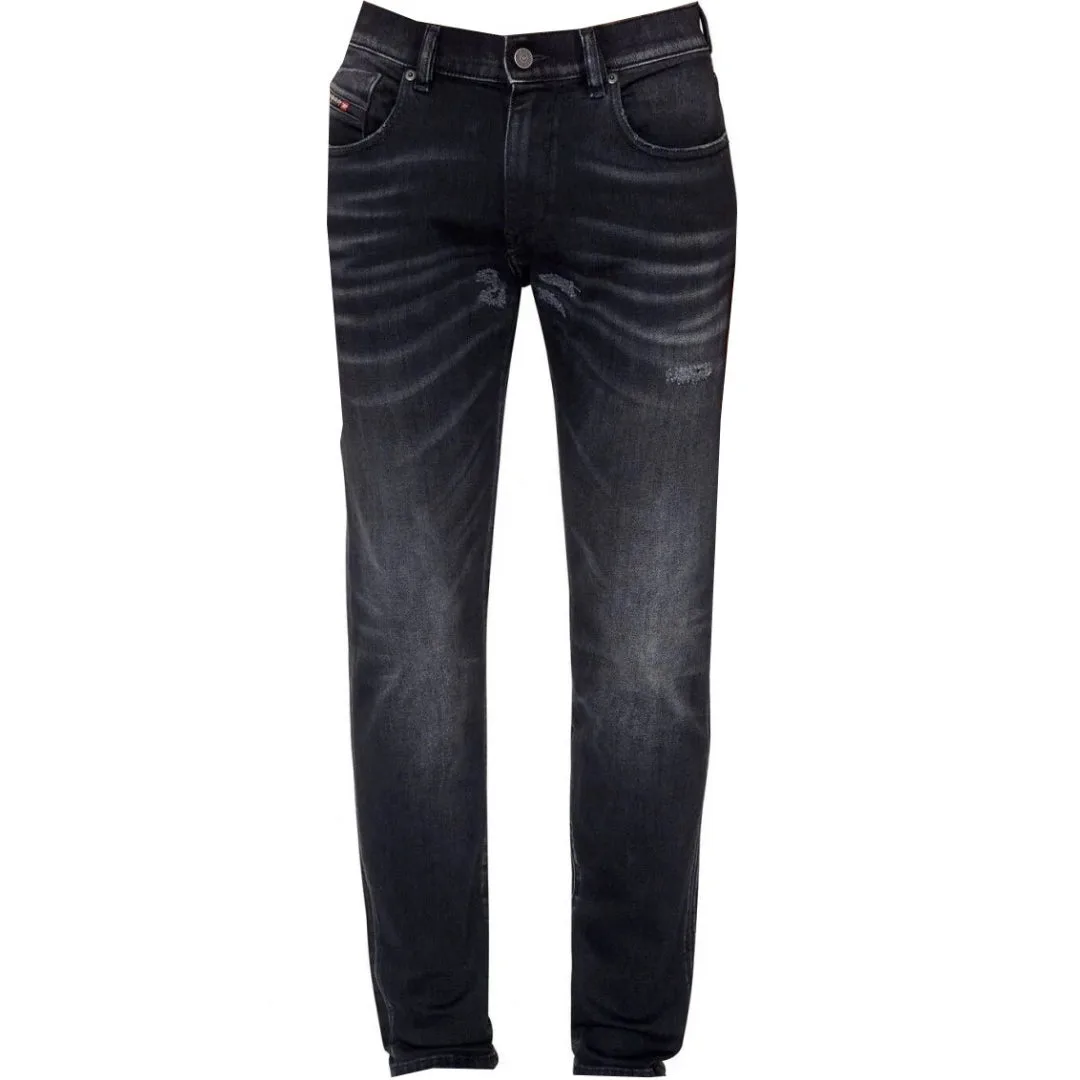 Diesel zwart denim, Diesel merklogo op grote badge boven achterzak en muntzakje, 99% katoen, 1% elastaan __stretchdenim, vervaagd denim, slim fit, taps toelopende pijpen, knoopsluiting, ritssluiting, zwarte spijkerbroek, vernietigd versterkt denim