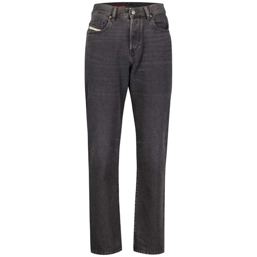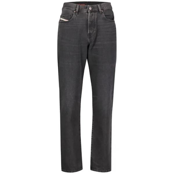 Diesel zwarte jeans, normale taille, taps toelopende pijpen, knoopgulp, 100% katoen, zwart denim, D-gestikte badge, zwart denim