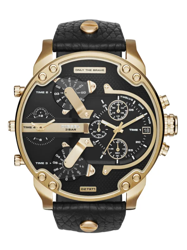 Diesel DZ7371 DADDY 2.0 horloge. Het oversized horloge heeft een roestvrijstalen kast en is voorzien van een analoog chronograaf quartz uurwerk. Het is compleet met een echt leren band en heeft een zwarte wijzerplaat. EAN 0698615111510