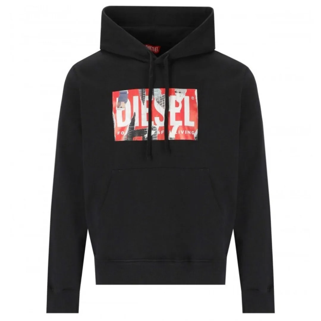 Diesel zwarte hoodie, 100% katoen, grote kangoeroezak, normale pasvorm, valt normaal qua maat, geribbelde mouw- en taille-uiteinden, zwarte hoodie, trui met capuchon
