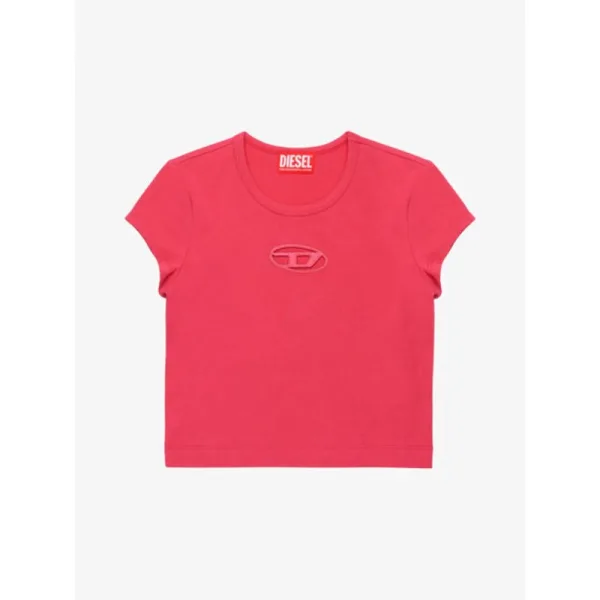 Het Diesel Junior Tangie T-shirt in de kleur Strawberry Red heeft een slim fit pasvorm en valt wat korter. Het shirt heeft een geborduurd logo en valt klein. Wij raden een maat groter aan.