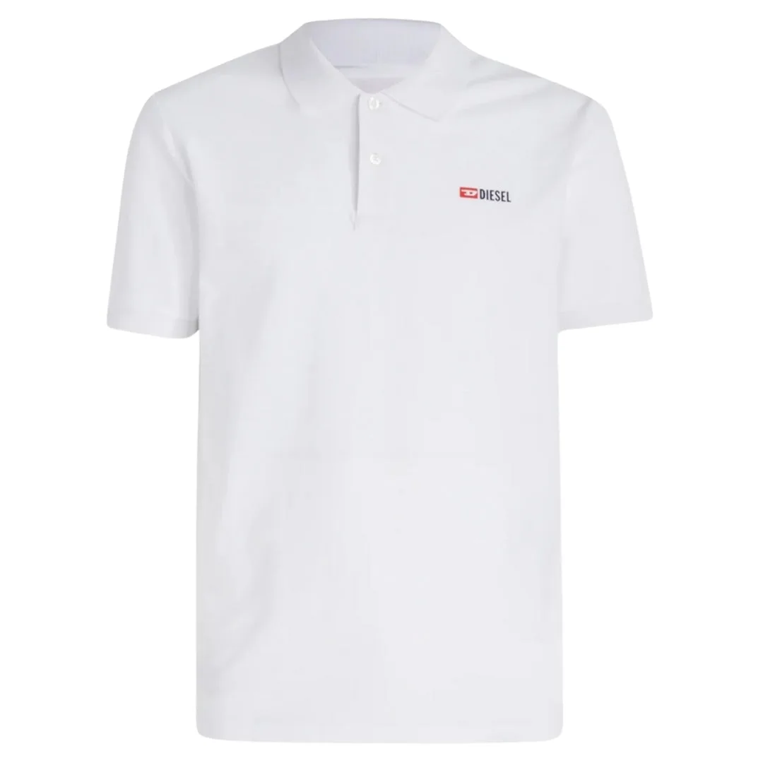 Blijf comfortabel en modieus in deze Diesel polo, kraag, korte mouwen, 100% katoen, knoopsluiting, gemaakt in China, elastische mouwuiteinden, normale pasvorm, getrouw, witte polo.