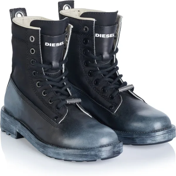 60% rundleer, 40% polyester; Diesel-enkellaarzen; Model: Y02428P1905T8013; Hoogwaardige afwerking; Klassieke vetersluiting; Antislip rubberen zool; Ronde dop; "Gebruikt uiterlijk"; Diesel-logodetails