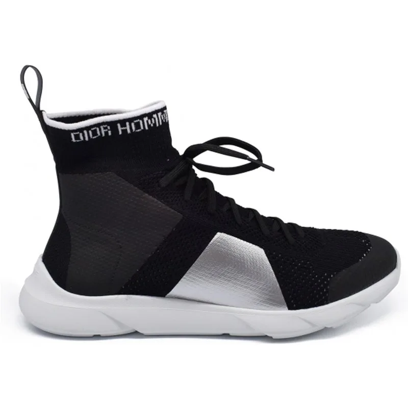 Zwarte technische gebreide Dior-sokken met veters.Witte rubberen zool.Zwarte, grijze en rode prints.Gemaakt in Italië.