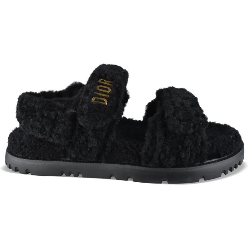 Dioract sandalen van zwarte schapenwol.Twee verstelbare klittenbanden voor en één bij de hiel. Dior logo in goudmetaal op één band.Zwarte gekartelde zool.Open teen.Made in Italy.