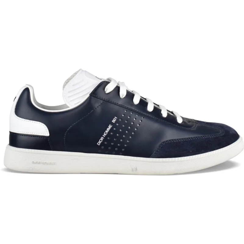 Dior sneakers, model B01, in blauw leer. Dior Homme B01 in wit bedrukt op de zijkant. Perforaties aan de zijkanten.Witte tong met CD-logo.Witte toonbank met blauwe bij.Witte veters.Ronde suède neus.Witte rubberen zool met logo.Gemaakt in Italië.