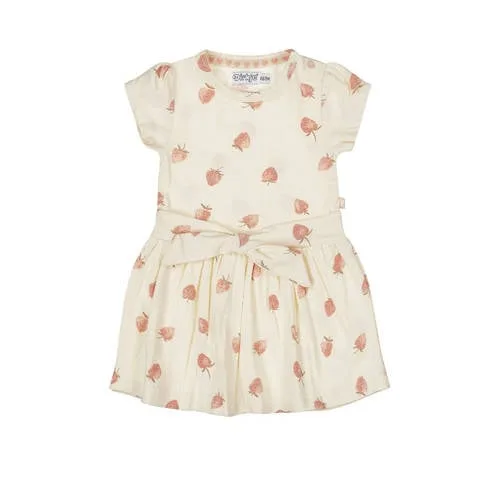 Deze jurk voor meisjes van Dirkje is gemaakt van katoen en elastaan. De korte jurk in ecru en roze heeft een ronde hals en drukknoopsluiting. De mouw is kort en er zijn geen zakken.