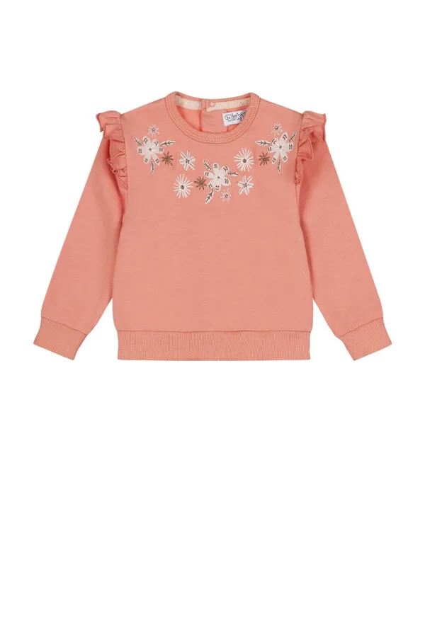 Deze sweater van Dirkje heeft een ronde hals en lange mouwen. De sweater is gemaakt van stretchkatoen. Geribde boorden en ruches zorgen voor een speelse uitstraling, ideaal voor elke dag.