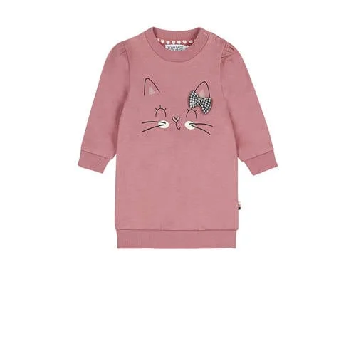 Deze jurk van Dirkje heeft lange mouwen en een ronde hals. De jurk is gemaakt van katoen met elastaan. De printopdruk en 3D applicatie zorgen voor een speels effect, geribde boorden maken het af.