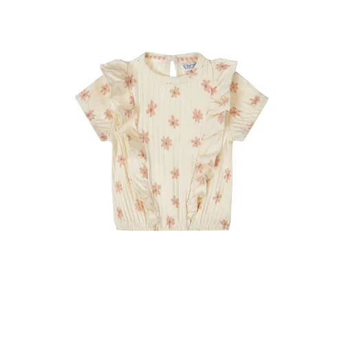 Dit meisjes T-shirt van Dirkje heeft een ecru/mauve kleur. Gemaakt van katoen met elastaan voor een comfortabele pasvorm. Het T-shirt heeft een ronde hals, korte mouwen, elastische boord, rib gebreid en ruches.