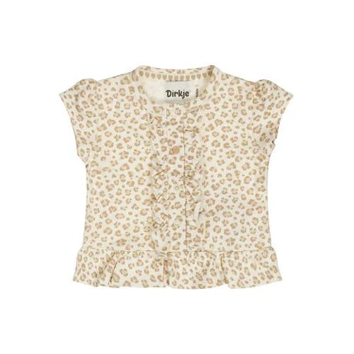 Dit Dirkje T-shirt met korte mouwen voor meisjes is een fijne basic voor elke dag, met een speels dierenprintje dat toch rustig oogt door de ecru kleur. Het shirt heeft kapmouwen en een ronde hals, waardoor het luchtig zit en makkelijk te combineren is met broeken, rokjes of een zacht broekje voor thuis.Zachte ribstof met stretch Gemaakt van achtentachtig procent katoen en twee procent elastaan voor een soepel vallende, zachte stof met lichte stretch Rib gebreide structuur die mooi aansluit zonder strak te voelen Ecru basis met panterprint voor een subtiel dierenmotief Kapmouwen die de schouders net bedekken en extra bewegingsvrijheid geven Praktische drukknoopsluiting, handig bij het aan- en uitkleden Geschikt voor dagelijks gebruik in de 'Daily' collectie van Dirkje Wasbaar op 30 graden, lauw strijkbaar en geschikt voor een regulier droogprogrammaPraktisch in het dagelijks levenDoor de drukknoop bij de hals gaat het T-shirt makkelijk over het hoofd, ook bij kleinere kinderen. De zachte ribstof met stretch beweegt mee bij spelen, kruipen en rennen en blijft prettig zitten onder een vest of trui.Dirkje: comfortabele kinderkledingDirkje staat bekend om kinderkleding die aansluit bij het dagelijkse leven van kinderen. Met aandacht voor comfort, praktische details en vertrouwde materialen brengt het merk collecties die prettig dragen en eenvoudig te onderhouden zijn.Een comfortabele basis met een speels detail, ideaal voor elke dag in de kledingkast van je meisje.